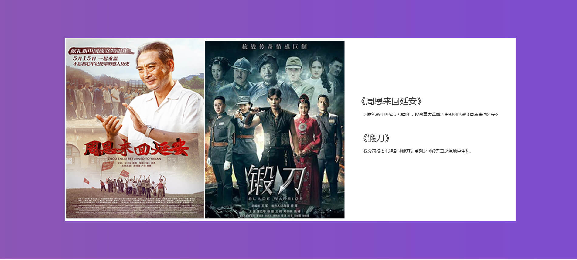 為獻禮新中國成立70周年,投資重大革命歷史題材電影《周恩來回延安》。2017年12月15日,電影項目啟動儀式暨新聞發(fā)布會在釣魚臺國賓館舉行。電影《周恩來回延安》從創(chuàng)作之初就受到了中宣部、文化和旅游部、中共中央文獻研究室、國家廣播電視總局等單位的關(guān)注和指導,并得到了周恩來同志的親屬及他曾經(jīng)的秘書、警衛(wèi)等各界人士的大力支持。該片上映后受到社會各界的高度評價,不僅作為教學課程在中共中央黨校點映,還入選中宣部、教育部等聯(lián)合主辦的“看紅色電影,愛偉大祖國”優(yōu)秀電影進校園系列活動播放影片。中宣部《黨建》雜志社更是召開以“弘揚周總理崇高精神,不忘初心、牢記使命”為主題的研討會,總結(jié)研討了該片的藝術(shù)成就、思想內(nèi)涵及現(xiàn)實意義。9月,該片獲得了第十五屆精神文明建設“五個一工程”獎。 《周恩來回延安》以1973年6月被檢查出患有癌癥的周恩來總理回到闊別二十六年的延安,延安的十三年往事歷歷在目,這方熱土養(yǎng)育了中國革命,養(yǎng)育了人民軍隊,形成了中國共產(chǎn)黨第一代領導集體,鑄就了中國共產(chǎn)黨的領導地位。演繹一代偉人對人民的深情牽掛,講述周恩來總理時隔26年回到革命圣地延安的短暫22小時,謳歌中國共產(chǎn)黨與人民血肉相連及不忘初心、不懈奮斗、砥礪前行的偉大精神。 影片上映以來,人民網(wǎng)、新華網(wǎng)、央視網(wǎng)等核心官方媒體紛紛給予肯定評價,好評如潮,可見影片影響之轟動和廣泛。